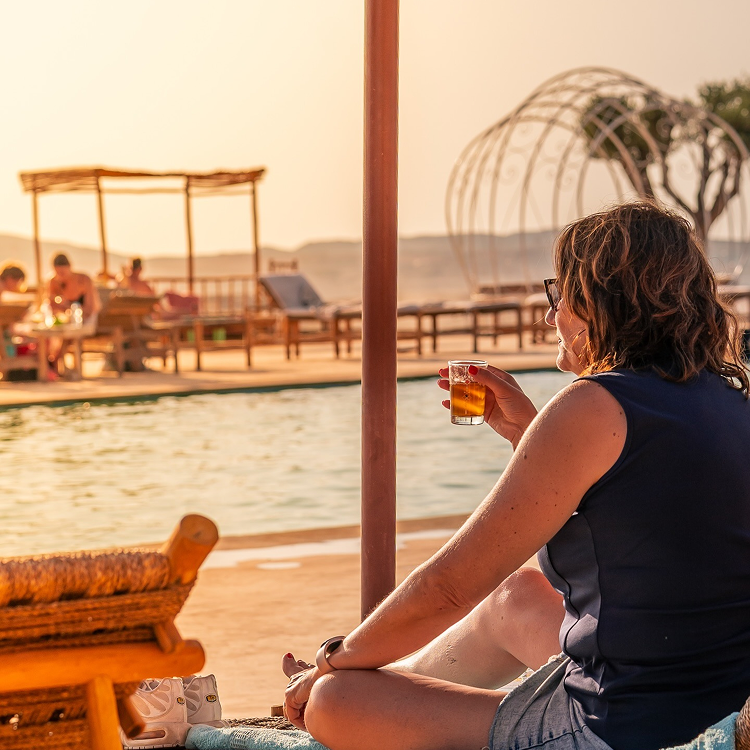 Enjoy a relaxing day by the pool, with a delicious traditional Moroccan lunch and dinner accompanied by live entertainment, all while admiring the stunning desert sunset.